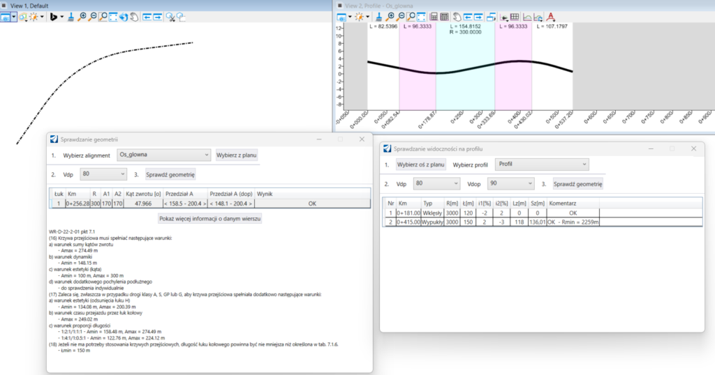 Skrypt sprawdza poprawność doboru łuków poziomych i krzywych przejściowych w planie oraz łuków pionowych niwelety ze względu na widoczność. Skrypt jest zgodny z zapisami obowiązujących WR-D.
