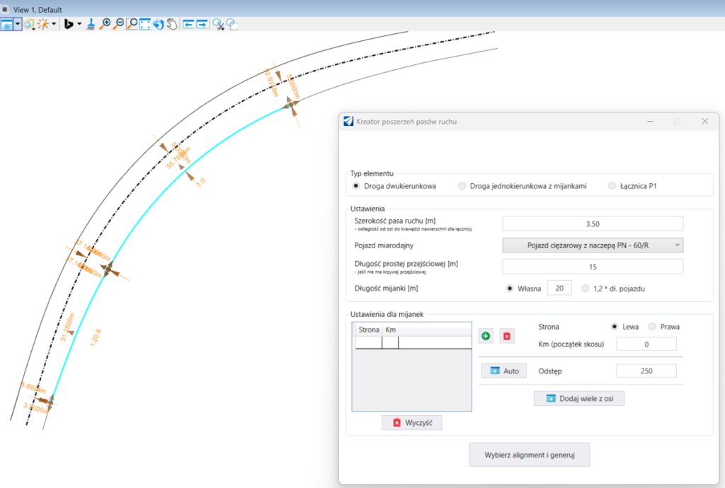 Skrypt tworzy automatycznie linie śledzenia do poszerzeń pasów ruchu na łuku, zgodnie z obowiązującymi WR-D. Wystarczy wybrać oś na planie.