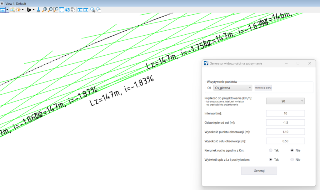 Skrypt generuje linie widoczności na zatrzymanie na podstawie zapisów WR-D. Tradycyjna metoda tworzenia linii widoczności polega na dzieleniu osi na odcinki (zależne od pochyleń niwelety). Skrypt sam odczytuje rzędne i metodą iteracji (opisaną w WR-D) oblicza długości widoczności. Wystarczy wybrać oś na planie.
