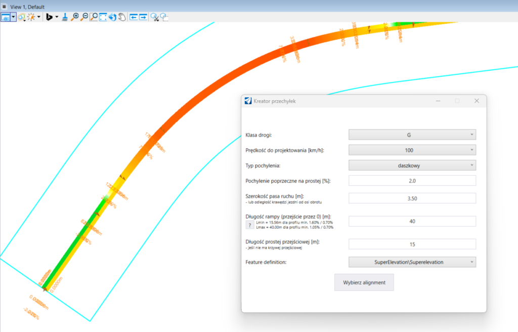 Skrypt tworzy automatycznie Superelevation wraz z wartościami pochylenia poprzecznego zgodnego z obowiązującymi WR-D.